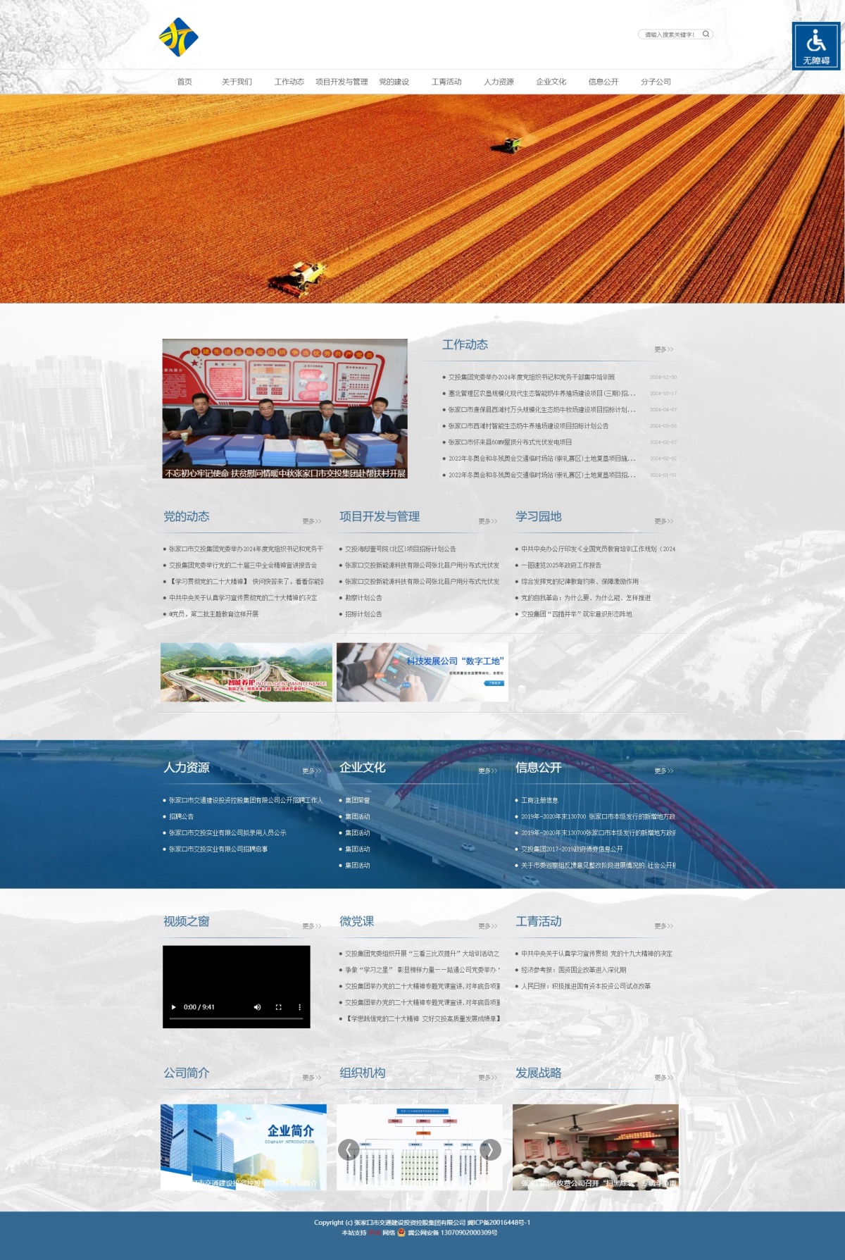 张家口市交通建设投资控股集团有限公司(以下简称交投集团)成立于2016年7月,是由张家口市国资委出资组建的国有独资公司,注册资金33.0968亿元。目前总资产146.53亿元。经营范围主要包括公路、铁路、机场、枢纽、场站等交通基础设施及配套项目建设和投融资;加氢制氢储氢全产业一体化开发建设,以及风电光伏等新能源建设运营和服务;园林绿化工程施工;农牧产品加工及销售;建筑材料销售;广告设计、发布;房屋租赁与销售;汽车租赁。公司拥有8个二级全资子公司、2个控股子公司、5个参股公司和2个代管理公司(农垦集团和轨道交通),职工1860人,党员341人。设立二级党委1个,党支部14个。